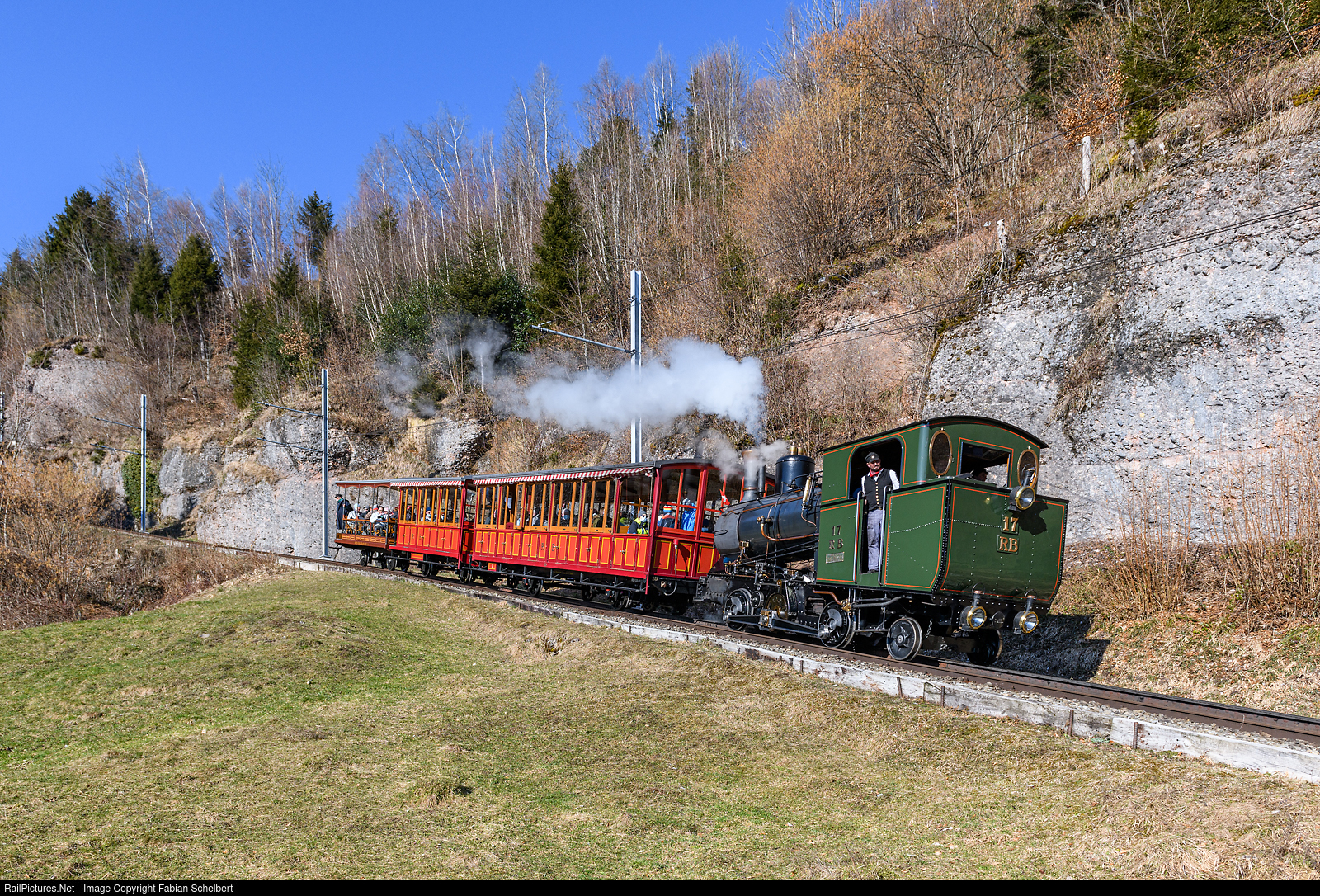 The youngest two cogwheel steam locomotives of the Vitznau-Rigi Railway are still used regularly for special trips. During the winter steam trip at the end of February, there was already no more snow in the lower part of the line. The H 2/3 17 brakes the cars 15, 5 and 11 in front of the stop Grubisbalm downhill.