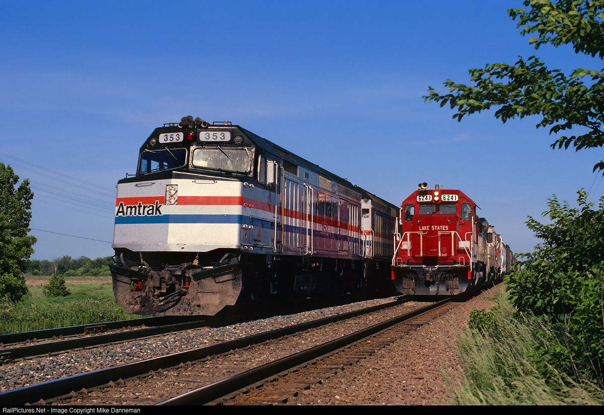 Amtrak’s westbound Empire Builder passes Soo Line train 17 at Duplainville, Wisconsin, on the afternoon of June 6, 1987. Leading train 17 is a former Minneapolis, Northfield & Southern EMD SD39, as Soo acquired MN&S Nos 40-41 in the 1982 purchase of the railroad. After overextending themselves acquiring Milwaukee Road, Soo Line established a wholly-owned division called Lake States Transportation Division on February 10, 1986, to operate its mostly former Soo Line trackage in Wisconsin and prepare it for sale. With this move, older locomotives and some leased power began to be much more common on these lines. Soo Line No. 6241 was the only locomotive that featured “Lake States” lettering on its nose.