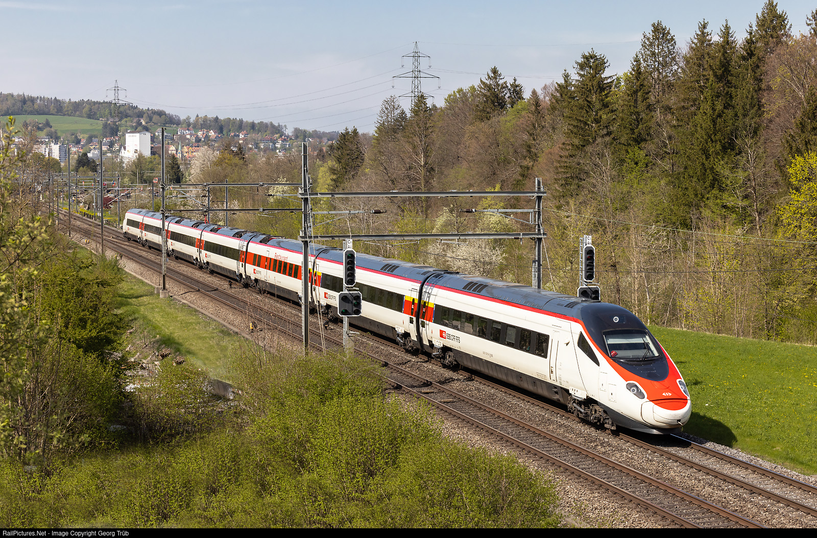 | Highspeed tilting train RABe 503 # 015 (ETR 610) of the SBB is running the EC 192 from Munich via Lindau Reutin-Bregenz-St.Margrethen-St.Gallen to Zürich, between Winterthur Tössmühle and Kemptthal. The train was 3 minutes late only ;-) |