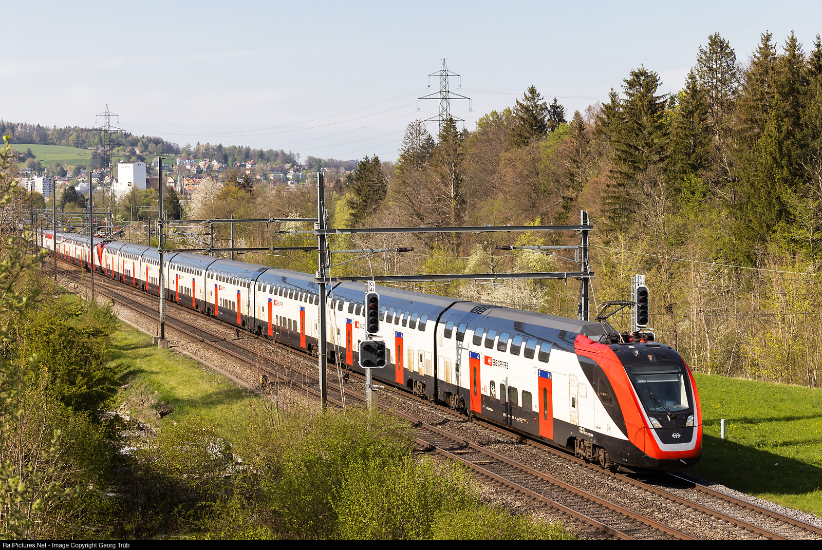 | "FVD" (Fernverkehr Doppelstockzug/Doubledeck train for long distances) RABe 502 # 215 (IR200) and an unknown RABDe 502 (IC200) in multiple control are running the IC 728 of the line IC1 from St.Gallen to Geneva Airport, between Winterthur Tössmühle and Kemptthal. This is the planned consist of the IC 1. |