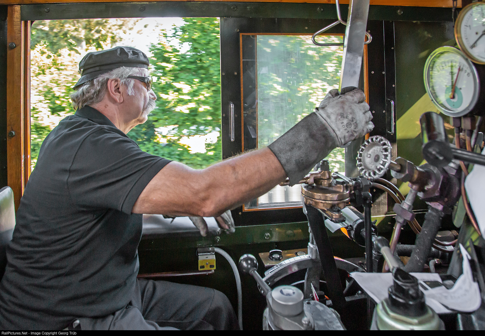 | Legendary engineer Sigi Liechti on the throttle of the 3000 horsepower 2-8-2 "Mikado" 141 R # 1244 on the light trip from Rothrist to Aarburg-Oftingen, to pull the IGE charter train over the Hauenstein afterwards. |
