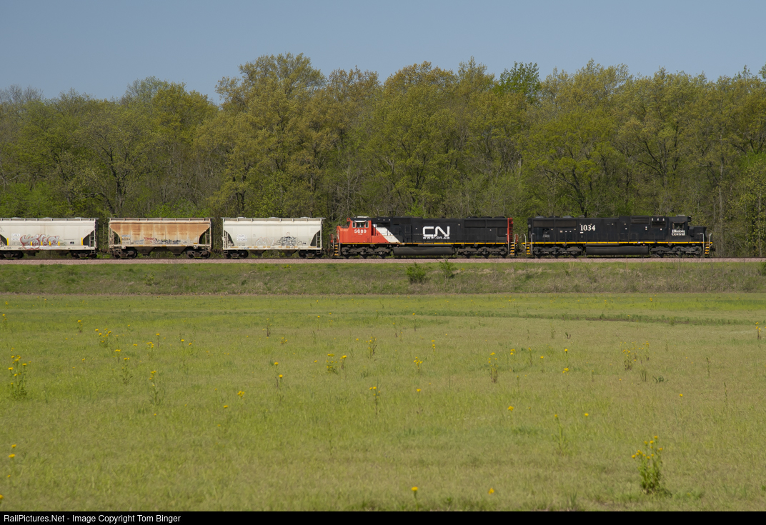 | CN local based out of Centralia, IL heads north across the Mud Creek floodplain toward the Prairie State Energy Campus with empty hoppers to be loaded with fly ash, which is the reside left after burning coal. |