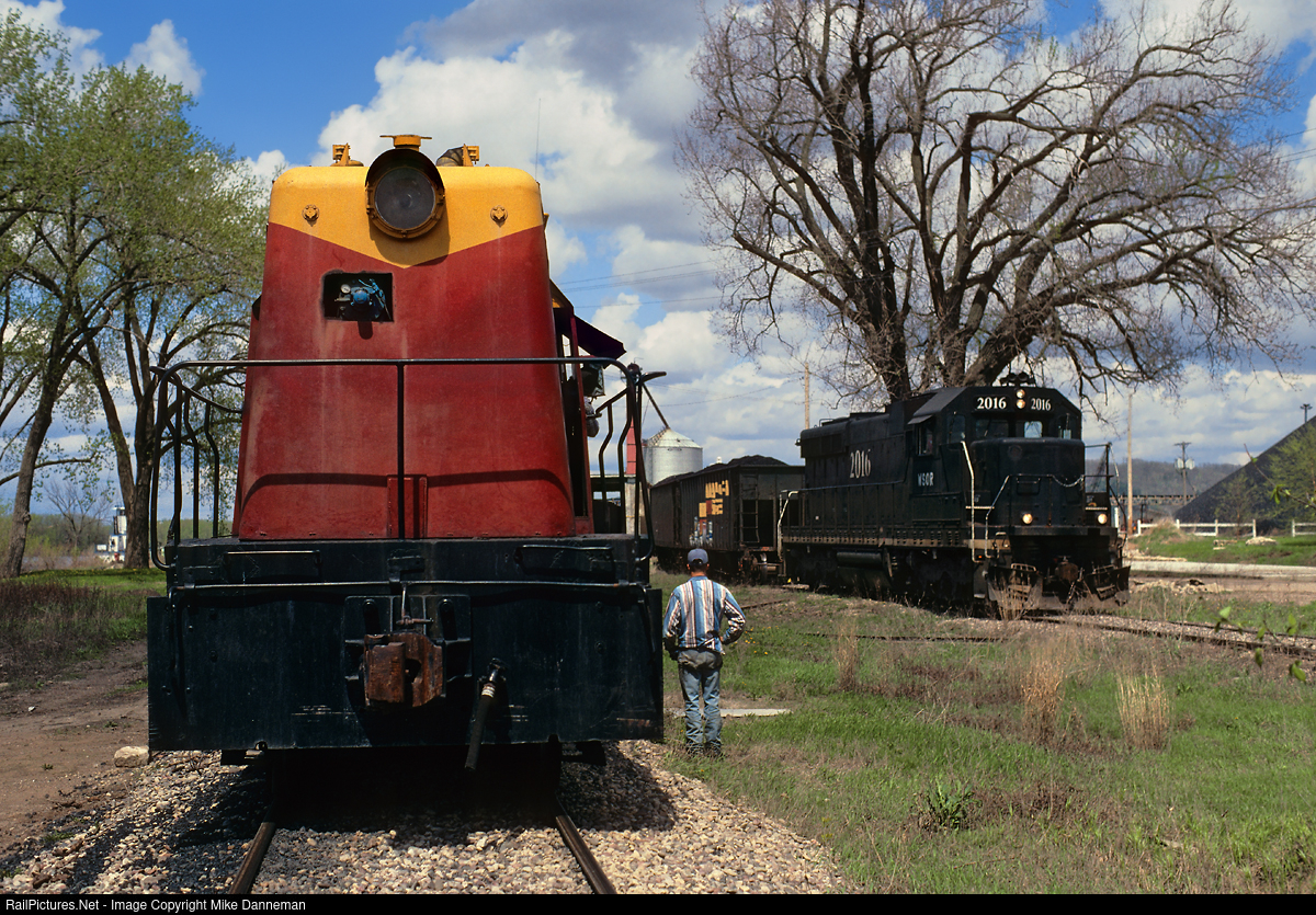 Coal for University of Wisconsin-Madison’s power plant arrived via barge on the Mississippi River at Prairie du Chien. It then was switched by this old Whitcomb locomotive, and picked up by a Wisconsin & Southern train. On May 8, 1997, the crew of the Whitcomb stands by as WSOR EMD SD20 No. 2016 picks up a string of loaded coal hoppers bound for Madison. The Whitcomb was built for the U.S. Army in 1943 as No. 7970. It was sold to Material Services, then went to Pillsbury in 1978, before becoming a numberless Prairie Sand & Gravel Co. locomotive, finally working coal hoppers at Prairie du Chien.