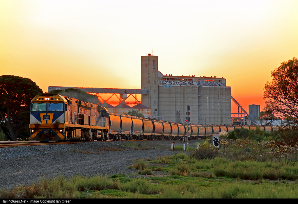 A pair of CF class locos haul a loaded Qube grain consist from NSW through Tottenham at sunset.
