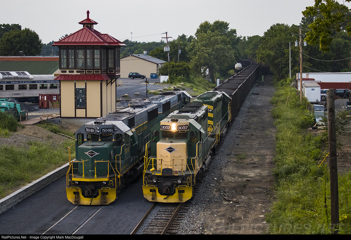 | Reading & Northern MVRG-22 (Minersville-Reading/NS) brings 90 loads of Quebec-bound Anthracite coal out of North Reading Yard and towards the connection with NS at CP-Belt at dusk. MVRG contains a combination of loads from the New St. Nick Breaker in Minersville and another loadout on the Reading Division and will be interchanged to NS, where their 520 crew will take the train to Morrisville, PA for export. To the left of MVRG is power off the day's NREX North Reading Extra. This move no longer occurs, as RBMN now heavily limits operations on NS due to PTC requirements. |