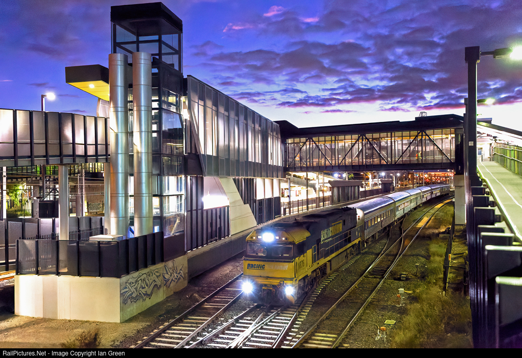 NR76 with the Adelaide to Melbourne Overland service passes through West Footscray shortly after sunset.
