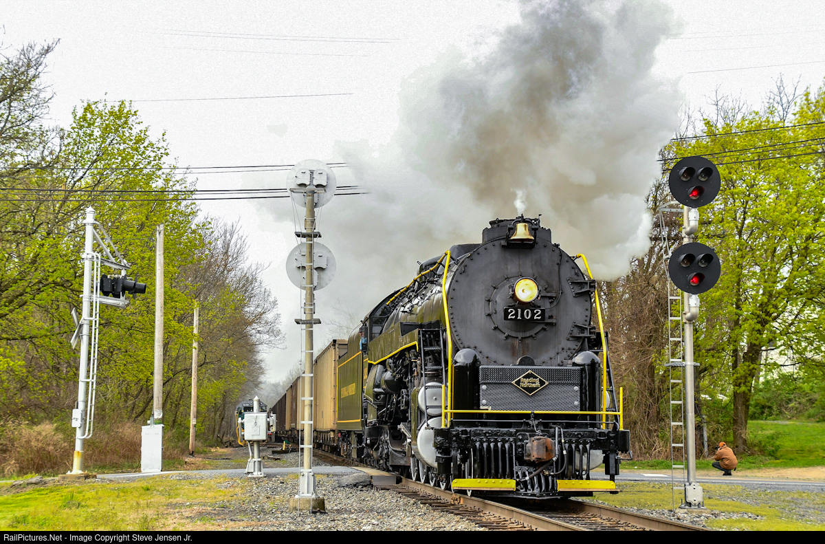 | Following a multi-year restoration by the talented folks at the Reading and Northern Railroad, former Reading Company T-1 #2102 splits the signals at Mohrsville at track speed while hauling an empty coal train during a test run. |