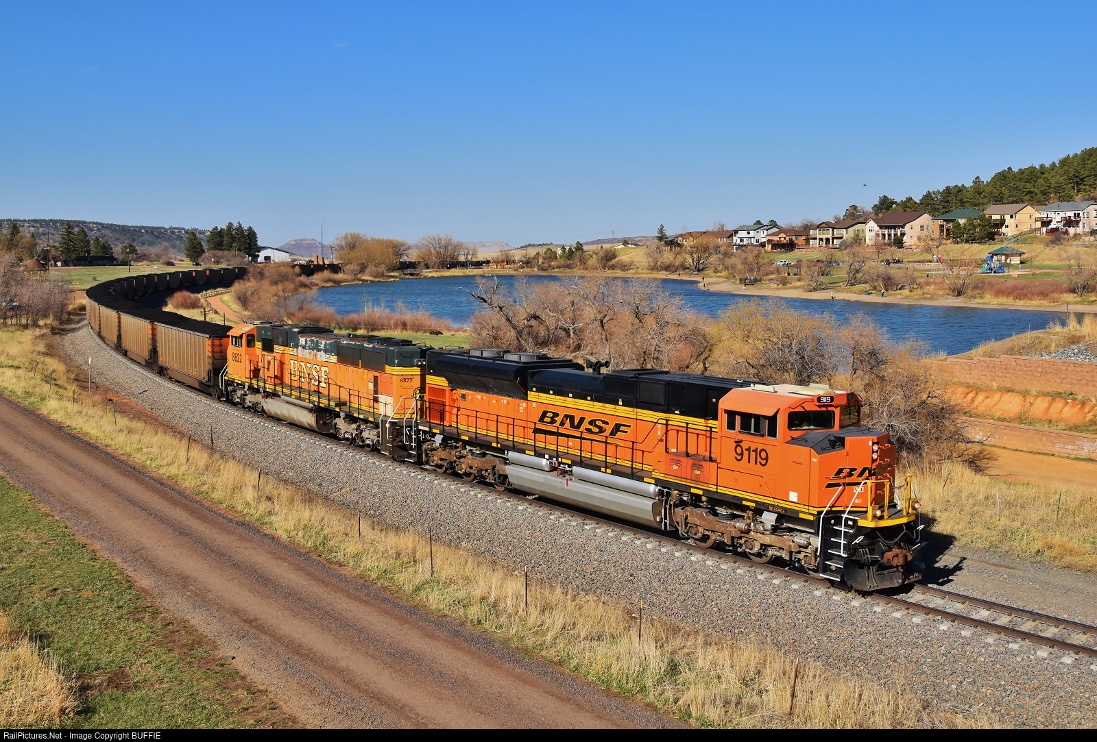 | BNSF 9119 (SD70ACe) leads a loaded coal train around the lake in Palmer Lake, Colorado. The lake was built to service steam locomotives making the long run from Denver to Colorado Springs.