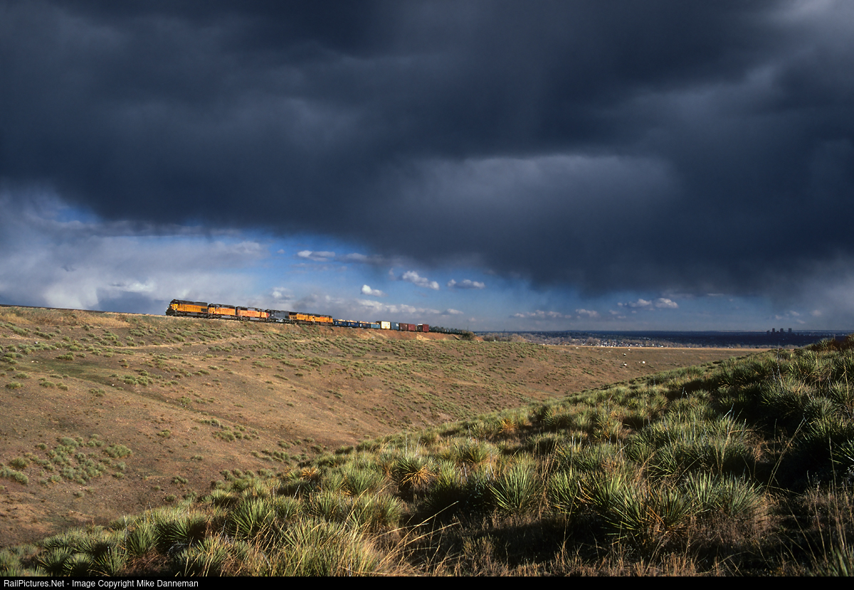 Climbing the two-percent ramp out Leyden, Colorado, under stormy skies is Union Pacific’s westbound MDVRO manifest freight on the afternoon of October 29, 1999. Six locomotives power the train, led by EMD SD45T-2 No. 4795. Trailing is a nice assortment of power that includes SD40-2, SD60M, a SP SD45T-2, GE AC6000CW and SD9043MAC models. On the far right, still shadowed by the dark clouds, is downtown Denver, its tallest buildings silhouetted against the distant horizon.