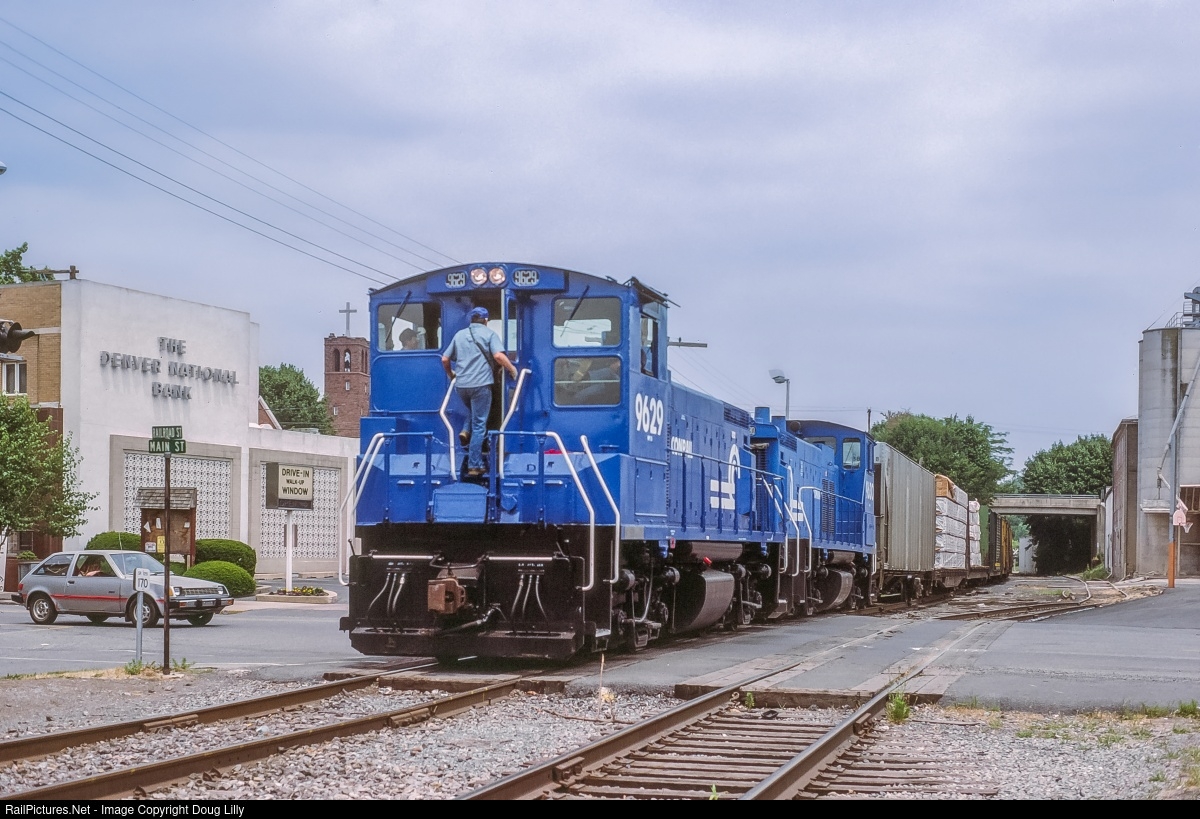 | After getting lunch at a local convenience store, the crew of Conrail local WHRE-10 has retrieved its train o continue its work. Here it crosses Main Street in Denver, Pennsylvania. The Denver National Bank would last another six years before being acquired by regional Fulton Bank. |