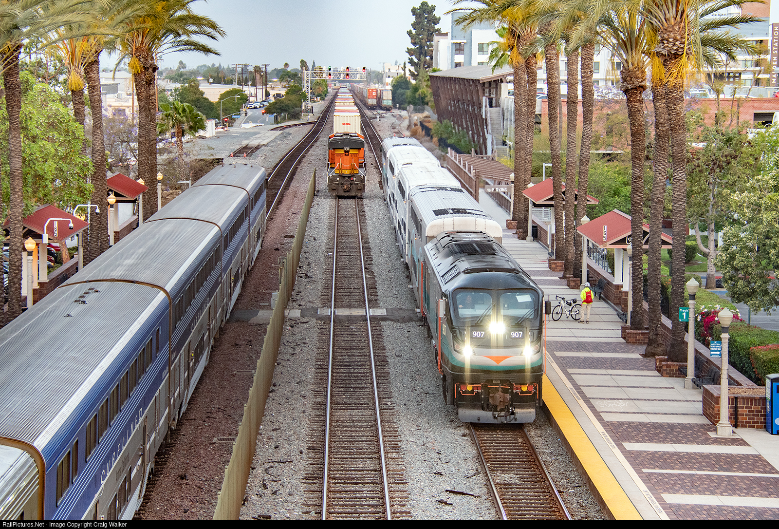 A busy morning, as usual, in Fullerton: Metrolink F125 907 brings a 91/Perris Valley Line train, heading from Los Angeles to downtown Riverside, into the station while, on Track 3, an Amtrak Pacific Surfliner, train number 761 (San Diego to San Luis Obispo) makes its stop. Meanwhile, Track 2 has been blocked since early the day before with a westbound BNSF baretable train (those containers are all empty), which is waiting for space to clear up in the port area of Los Angeles and Long Beach. It reportedly sat in this location for nearly four days! (Fullerton, California – April 29, 2022)