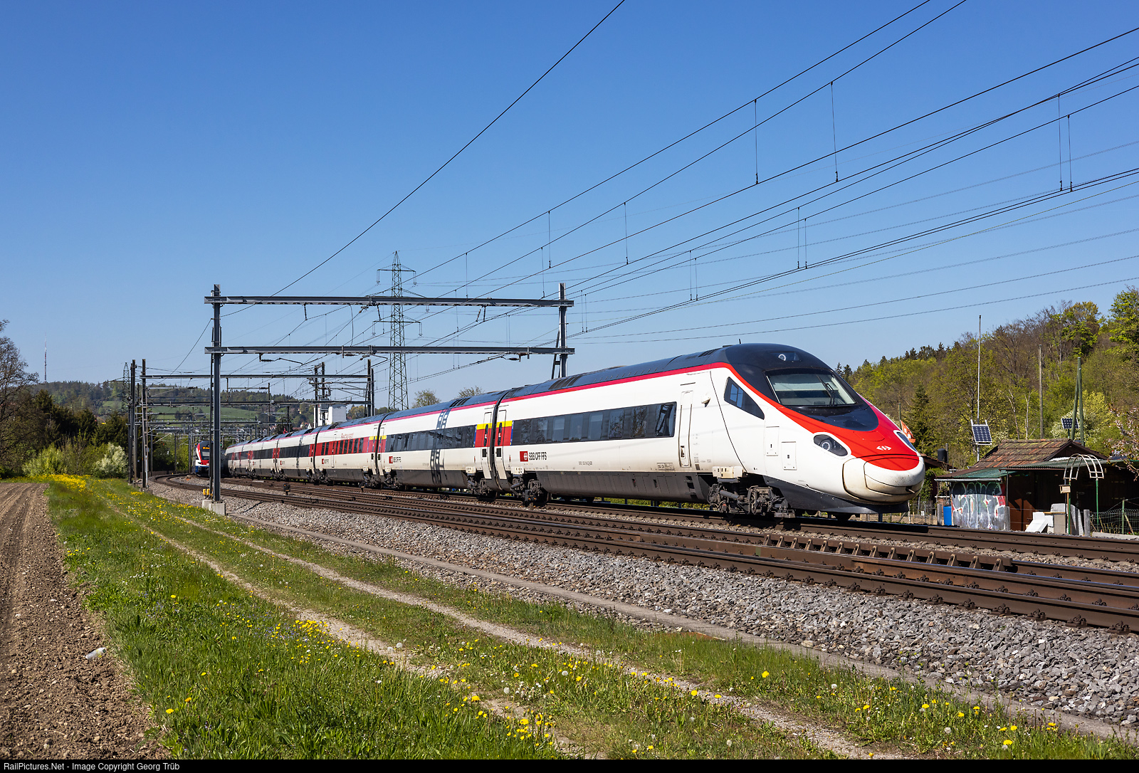 | Highspeed tilting train RABe 503 # 019 of the SBB is running the punctual Eurocity 192 from Munich to Zürich through Winterthur Tössmühle crossover station. |