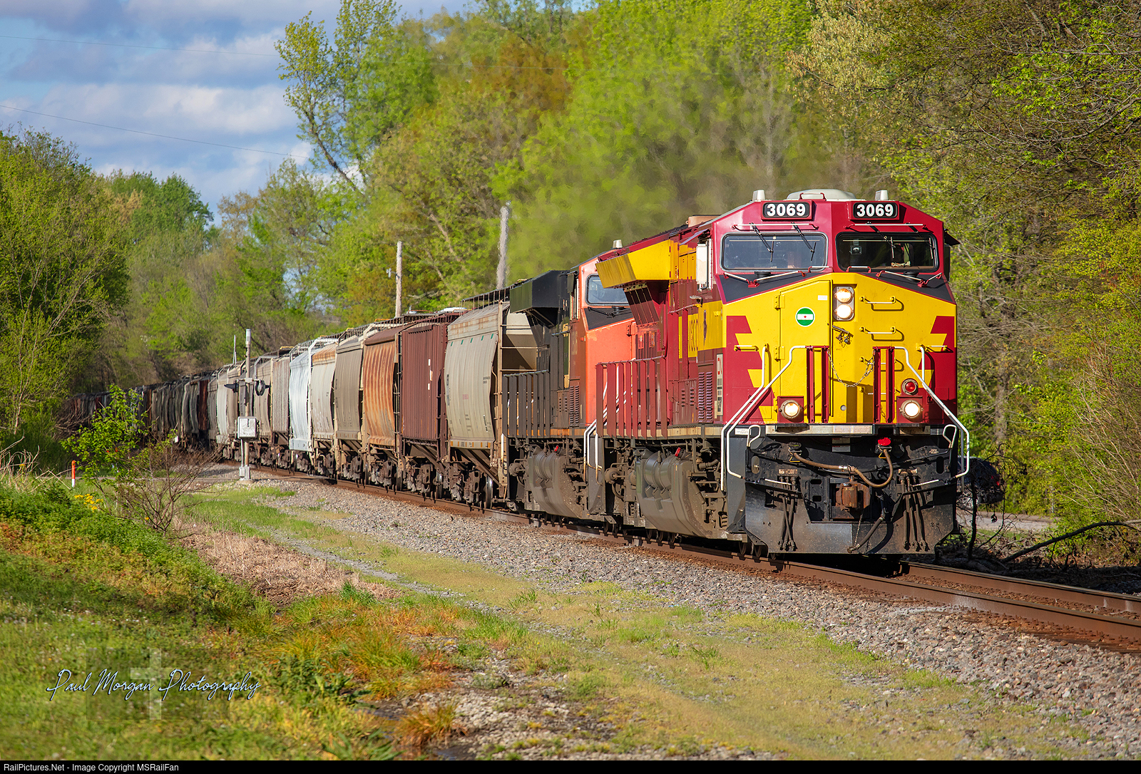 | CN 3069, the Wisconsin Central Heritage Unit leads SB Grain G884 through the small town of Lucy on its way to Memphis and then to Reserve, LA. |