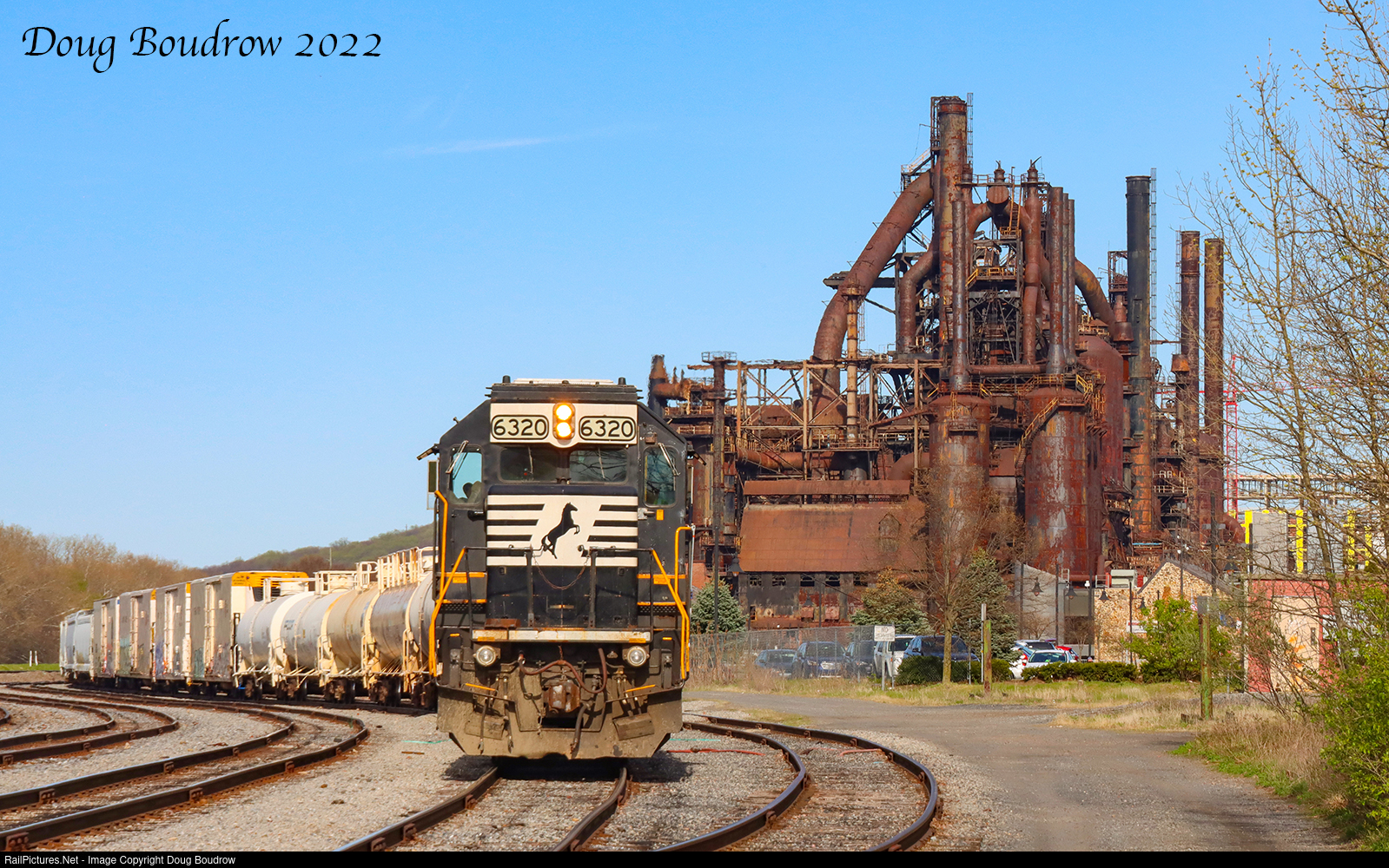 | Norfolk Southern local H65 is seen finishing up switching cars at "The River Yard" and is getting ready to head back to Allentown. Towering 230 feet above the train is the former Bethlehem Steel plant, founded in 1857 and operated through 2003. |