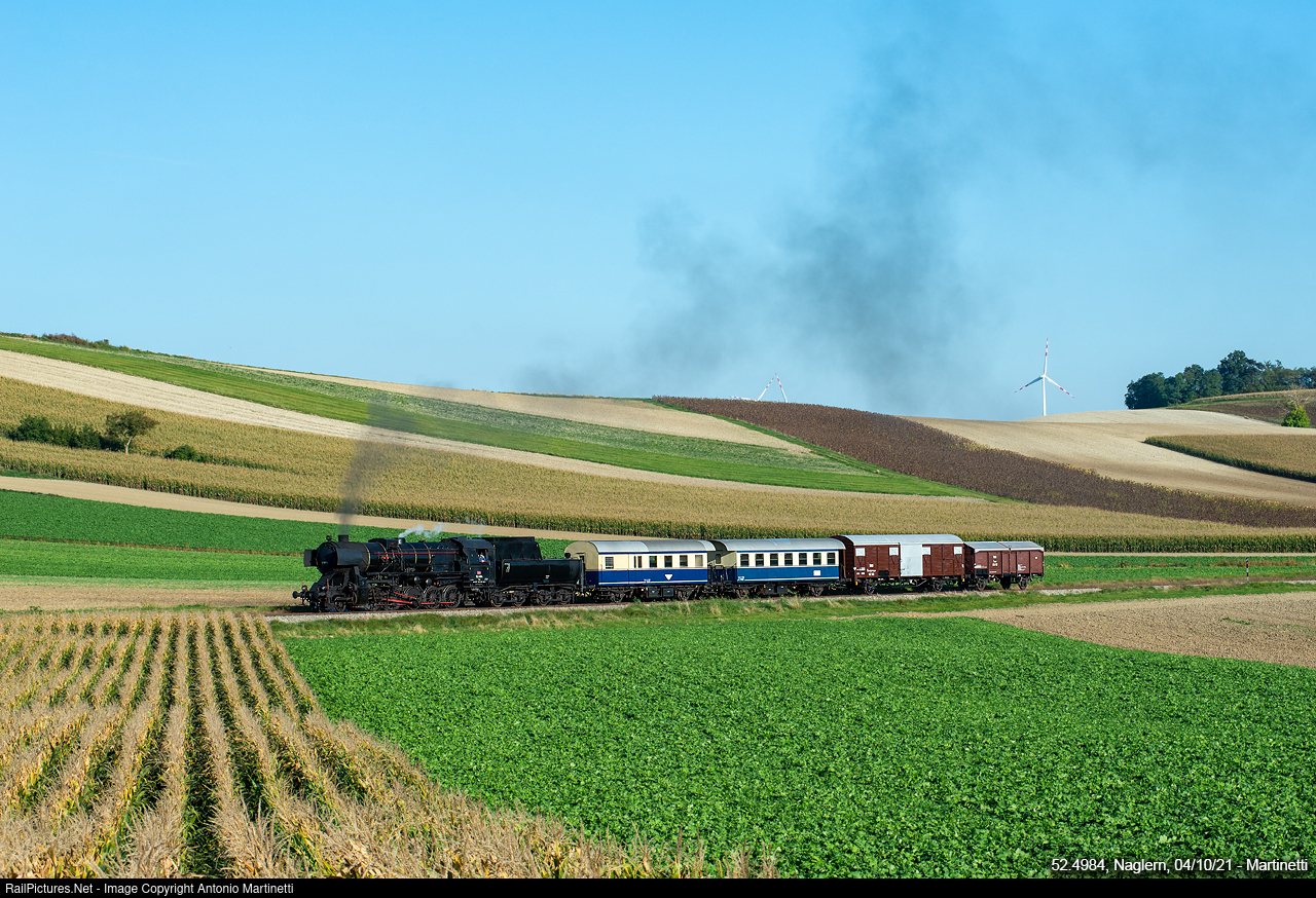 | Steam loco 52.4984, along with a short mixed composition, runs toward Ernstbrunn, as an afternoon chartered photographic special. |