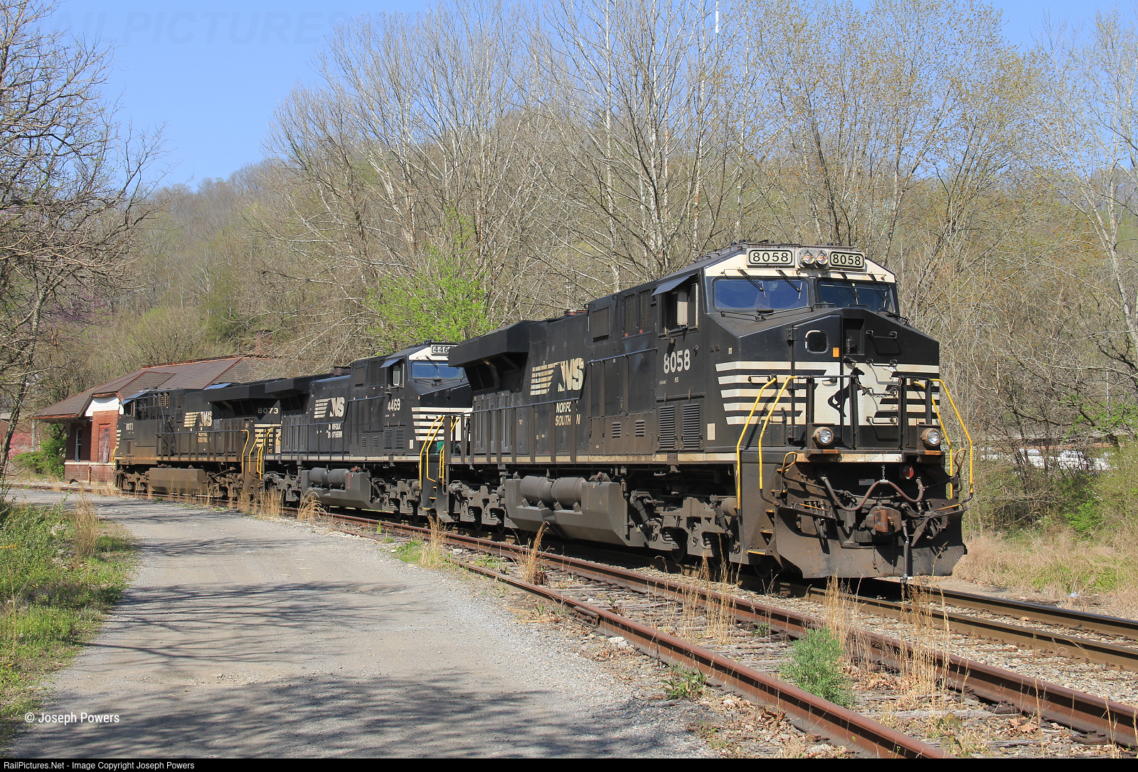 Two ET44ACs bracket a AC44C6M on one leg of the wye in Appalachia, Virginia. The three parked Norfolk Southern units will soon be put to use as DPU power on the rear of local mine run U48. The U48 crew will take a loaded coal train upgrade into Norton, Virginia and on to St. Paul, Virginia where another crew will take over the train.