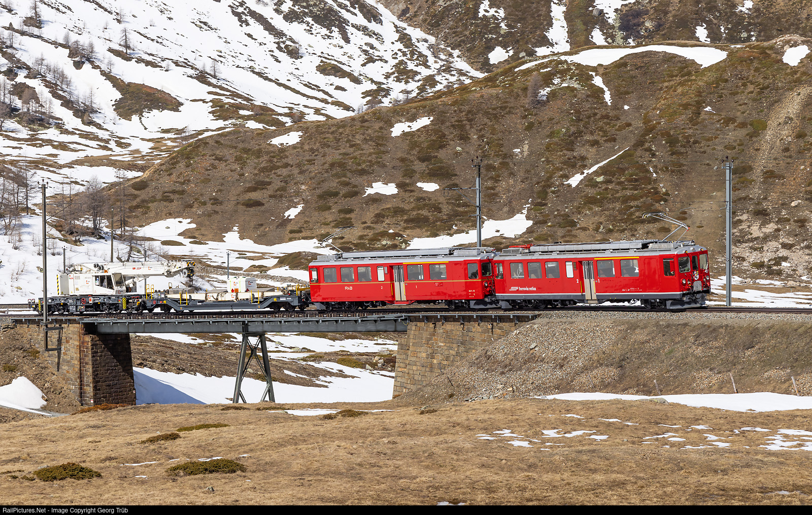 Railcars ABe 4/4 ("TW II") # 47 and # 46 of the Rhaetian Railway in multiple control, in service for the infrastructure nowadays and not for passenger trains anymore, are pulling the Kirow crane KRC 458-2S of the Rhomberg Sersa Rail Group, including the material car Xbk-v # 7712 with a total weight of about 120 ton, from Pontresina over the Bernina pass to Le Prese Incrocio (Cantoniera). The train is on the 7.0 % grade on the Alp da Buond Sur between Bernina Lagalb and Ospizio Bernina and is crossing the upper Ova da Bernina bridge, also called "wild west bridge". The KIROW crane was built in 2001 and has interchangeable bogies for usage on standard or 1-meter gauge. In august 2010, the crane had a severe accident near Fideris when placing a new bridge, it turned over. Before, the bogies and underframe were painted blue, since the rebuilding grey. The company Sersa Maschineller Gleisbau (SMG) has another very similar crane built in 2020, the "KRC 500" for use on 1-meter gauge only. The railcar ABe 4/4 # 47 was built in 1972, is used by the infrastructure, and has a glycol-water spraying device on one pantograph to prevent or minimize icing of the overhead contact line in winter. The railcar ABe 4/4 # 46 of 1965, used by the infrastructure as well, was brought back optical in the appearance of the early 1970', and is intended as a future historic vehicle.
