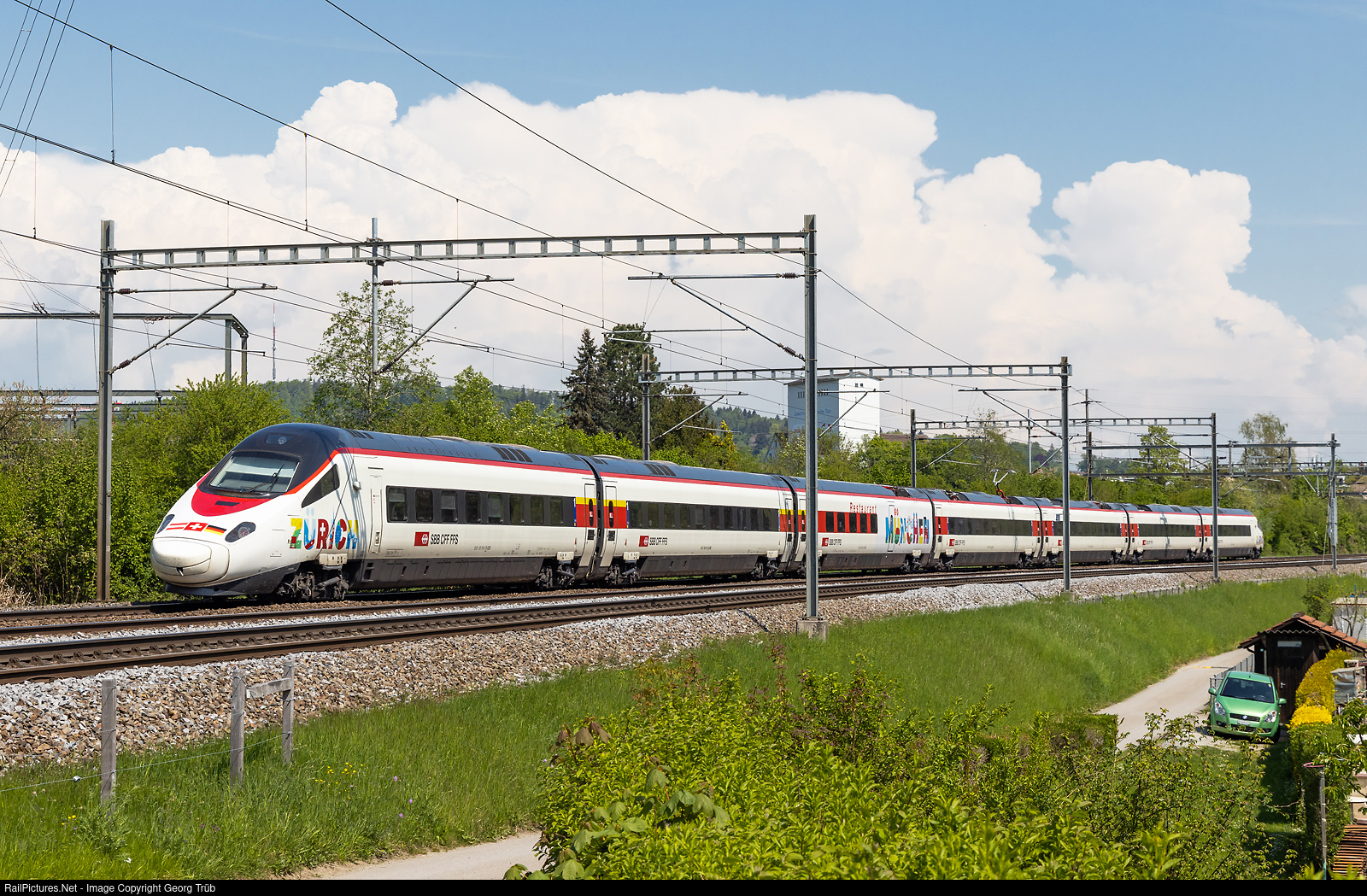| Highspeed tilting train RABe 503 # 018 of the SBB, in the special paint scheme for Zürich-München, is running the Eurocity 191 from Zürich via St.Gallen-St.Margrethen-Bregenz-Lindau Reutin-Memmingen to Munich. |