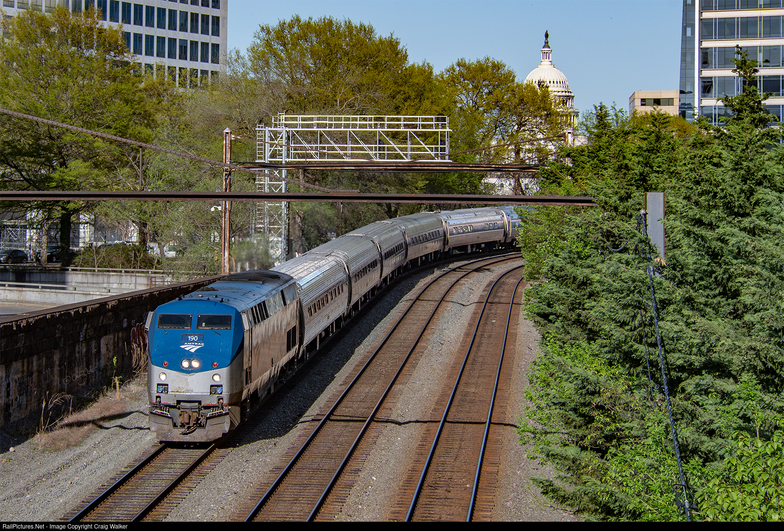 Amtrak Northeast Regional train 171 is roughly 460 miles into its nearly 500-mile journey from Boston, Massachusetts, to Manassas, Virginia, as it passes through Washington DC. AMTK P42DC 190 was added just a couple of miles back, at Washington Union Station, replacing the ACS-64 electric locomotive that pulled the train on most of this trip. The iconic dome of the United States Capitol looms in the background. (Washington DC – April 15, 2022)