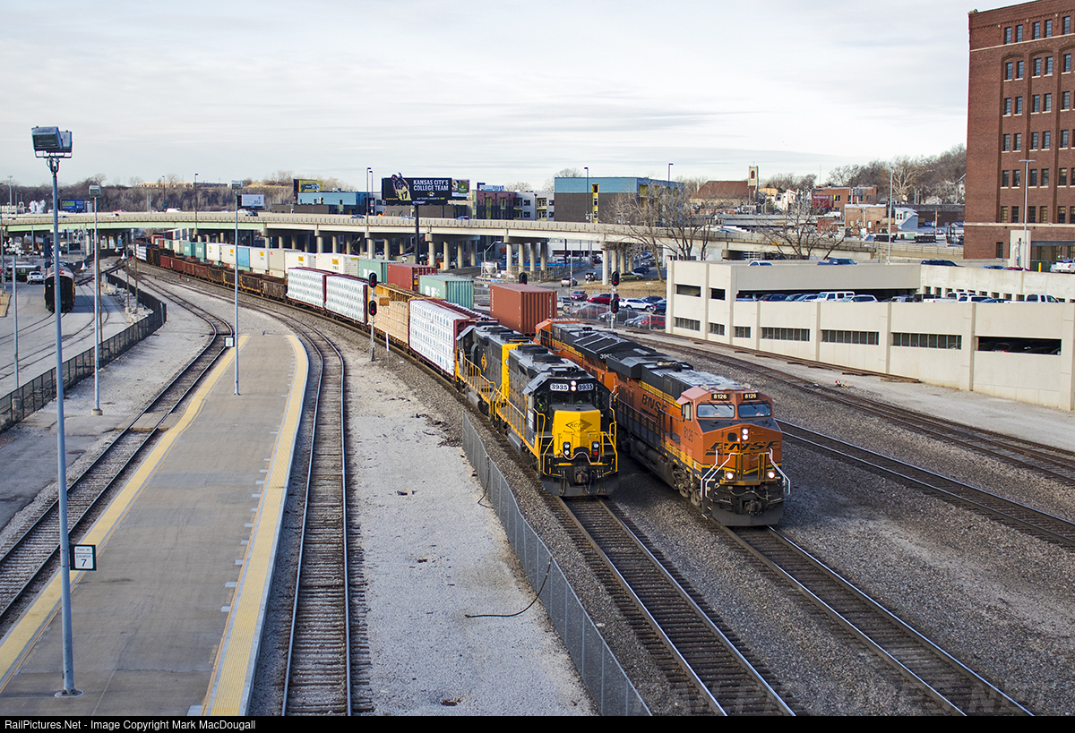 | Kansas City Terminal Job 310 holds back at Grand Ave. as BNSF Q-LACNSA3-05L makes its way through Kansas City towards the end of its Hobart Yard (Los Angeles) to NS/Ashland Ave. (Chicago) journey. The 310 is a transfer run from KCT's Mill Street Yard to Blue River Yard on the east end of the KCT. Powering it is the pair of ex-Delaware & Hudson GP39-2s that Watco assigns to the KCT. The west end of Kansas CIty's Union Station platform can be seen on the left. |