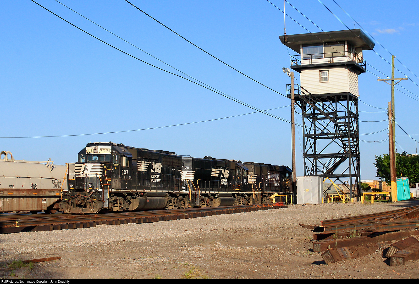 NS 3071 and company idles next to the Norfolk Southern yard tower.