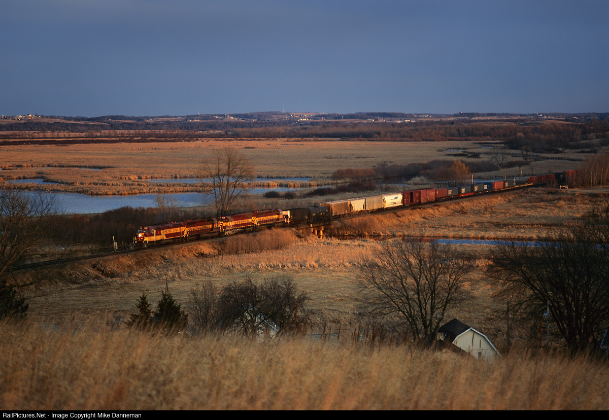 Theresa sunset Five minutes before sunset on April 5, 1996, Wisconsin Central F45 No. 6653, along with a trio of SD45s, crosses the Rock River as it rolls train 49 through the marshlands at Theresa, Wisconsin.