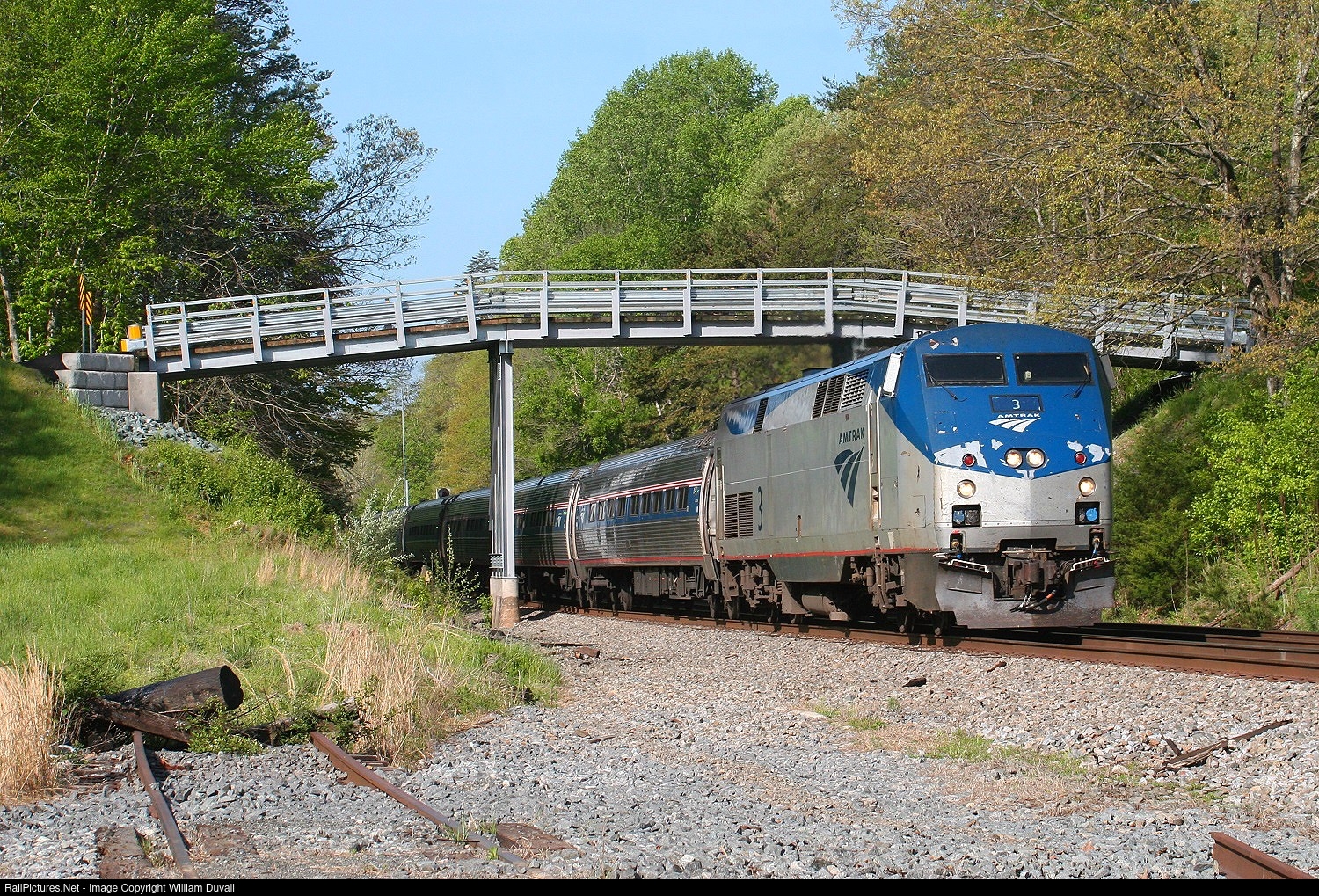 The northbound Amtrak Northeast "Roanoke" Regional train passing under the recently constructed Gilbert Station Road bridge. Genesis locomotive #3 was built in 1996.