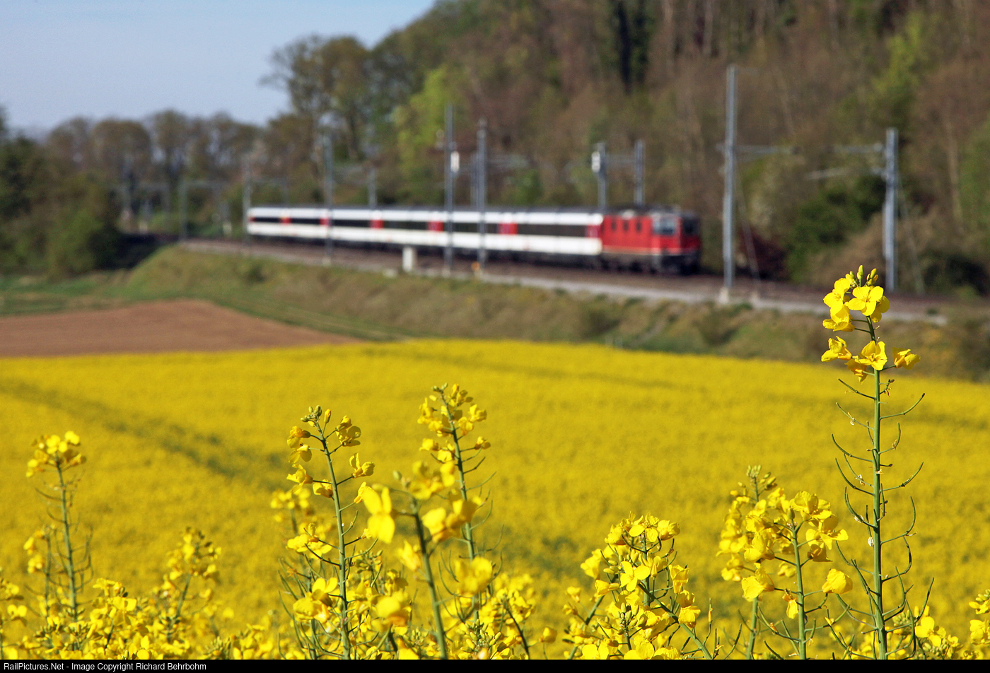 Canola oilseed in full splendor. A locomotive Re 420 heads Intercity Zürich - Singen (-Stuttgart).