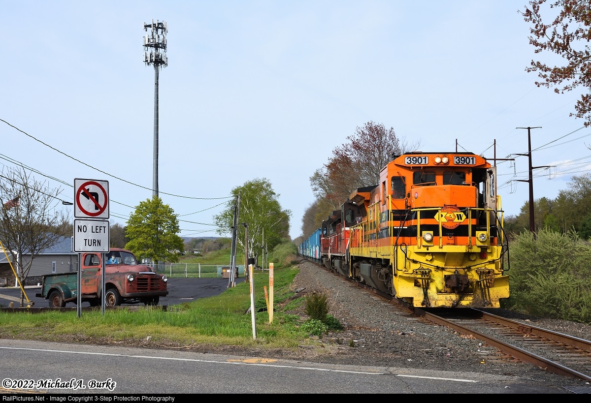 | The sun struggles to shine through the milky cloud cover, as train CT-1 with three B39-8s for power approach Route 150 in Wallingford. This train is taking stone loads from Tilcons Reeds Gap quarry to Cedar Hill Yard. Later at night, a new crew operating as train CHFP will make the trip to Fresh Pond Yard in Queens, NY. The antique truck on the left is home to the Connecticut Street Rod Association. |