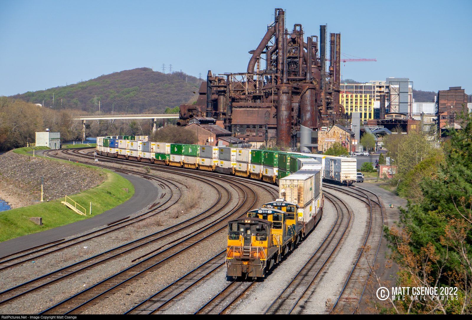 Double Stacks at SteelStacks. Lehigh Valley Rail Management (LVRM) no. 19 is seen with two other units pulling double-stack intermodal cars into the interchange tracks in Bethlehem, PA. The massive Bethlehem Steel mill, now known as "SteelStacks," looms large in the background.
