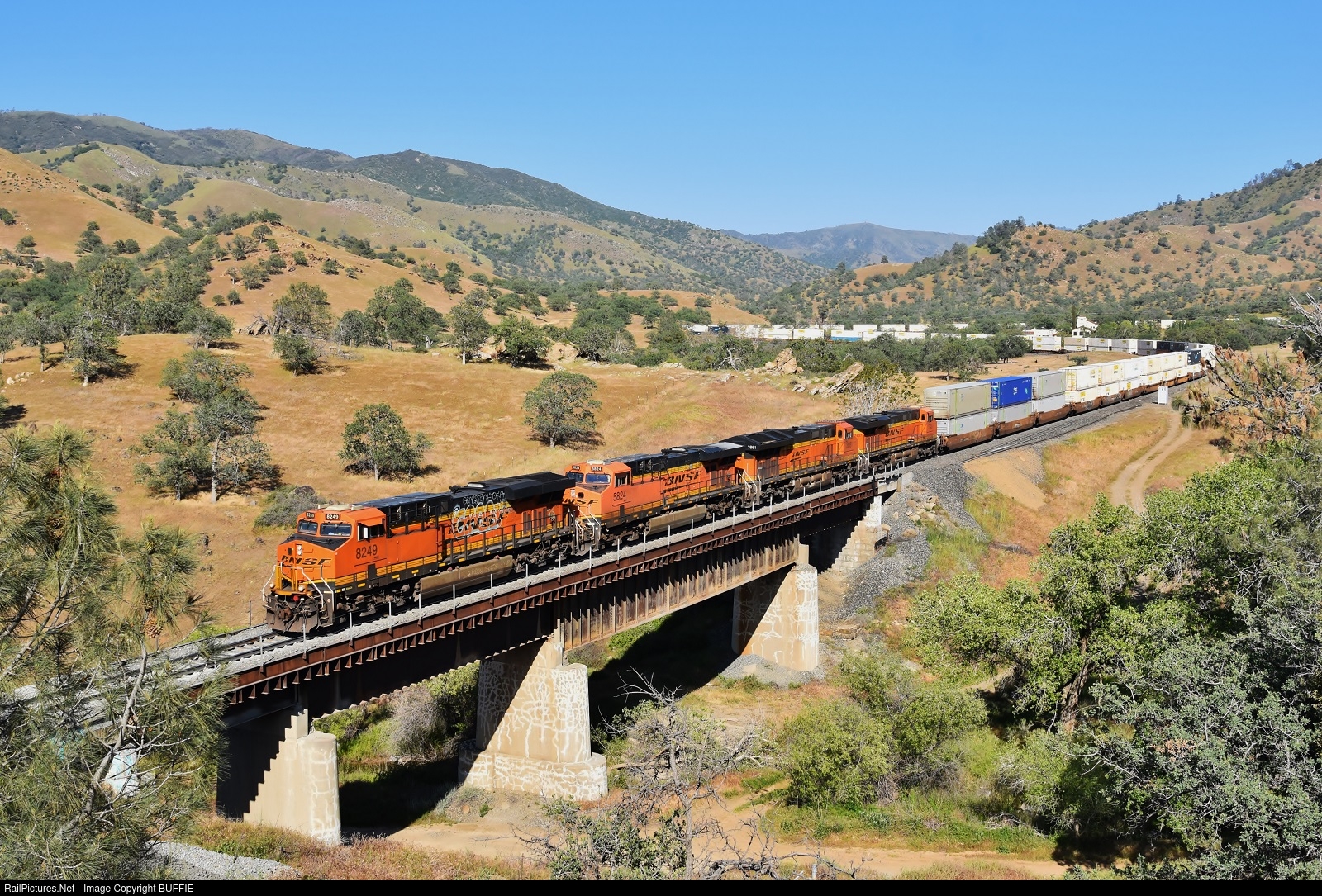 BNSF 8249 (ES44C4) leads a stack train over a scenic bridge at Cable, California which is west of the Tehachapi Loop.