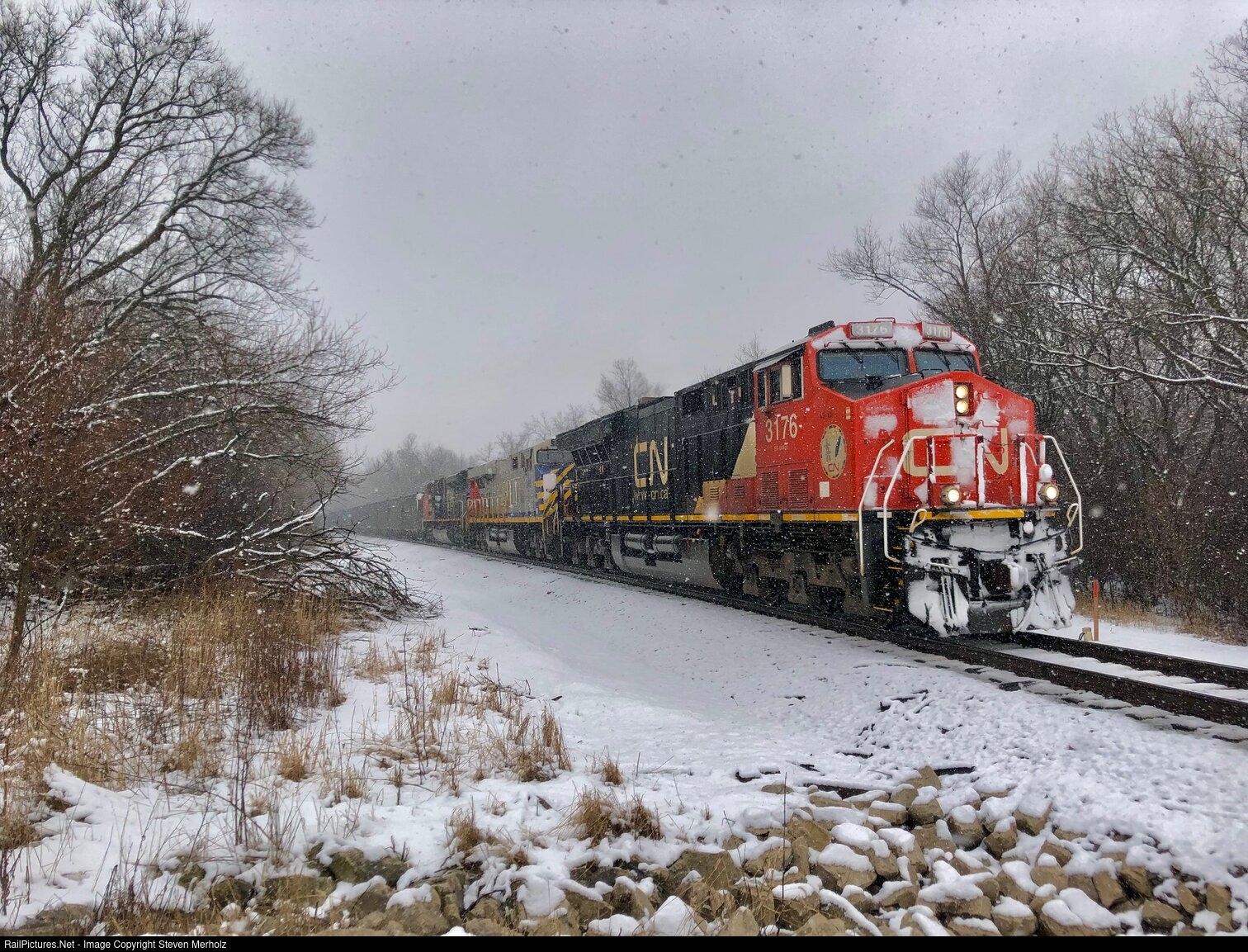 | In a heavy snow squall, a Canadian National rock train charges north through Honey Creek with an ex-Citirail locomotive in tow. |