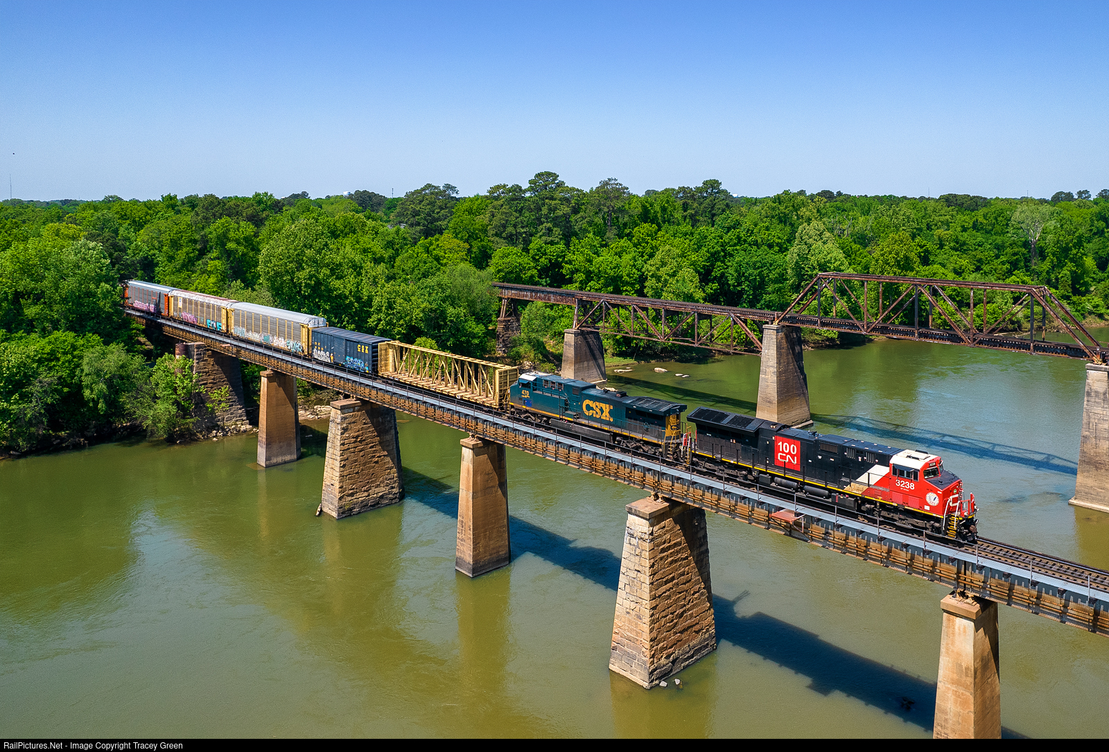 Canadian Visitor. In Columbia, we rarely see foreign power on CSX, so it was a nice treat to catch this CN unit, especially since it has the CN100 logo on it. This mostly autorack train departs Cayce for Greenwood, SC and then ultimately to Tennessee.
