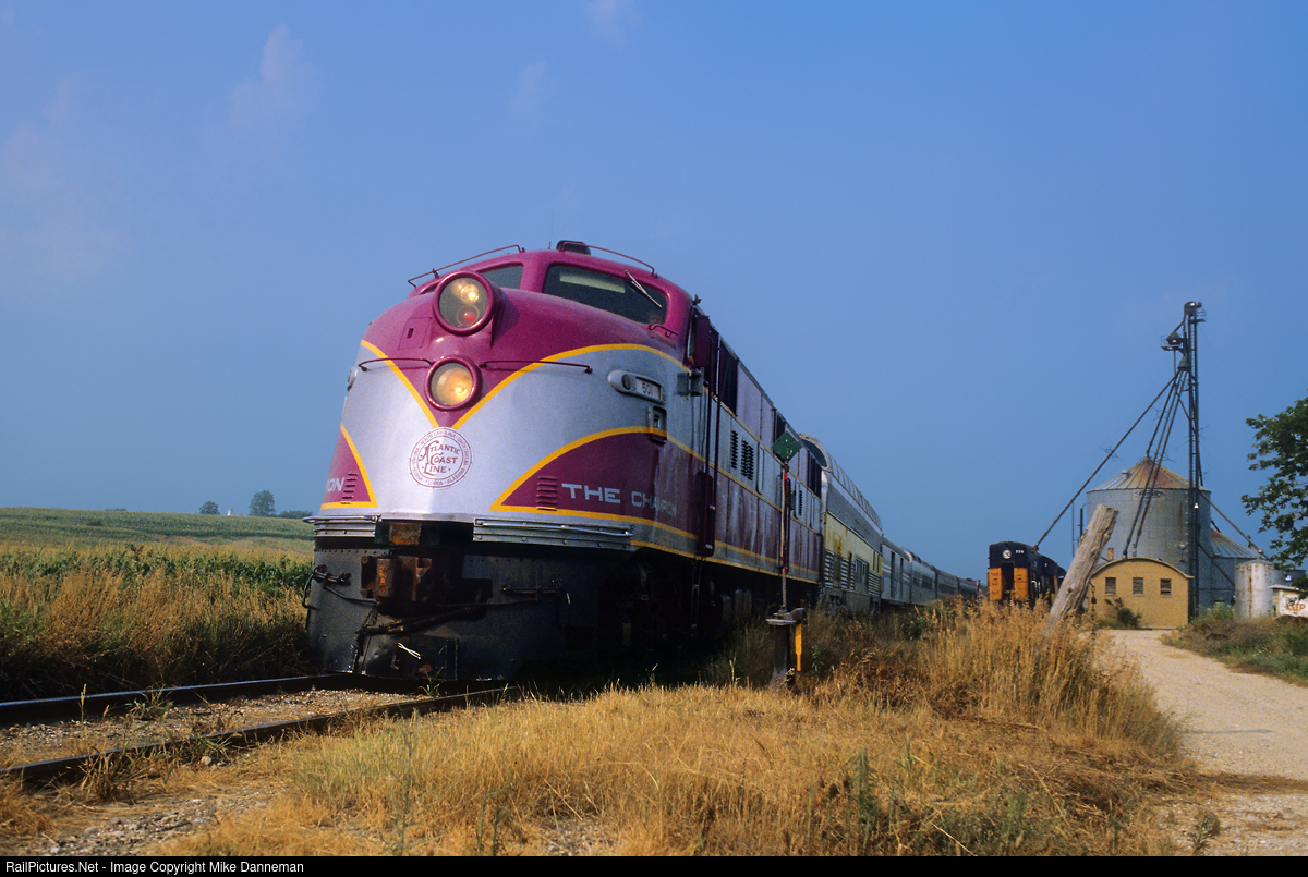 Glenn Monhart’s classy purple and silver Atlantic Coast Line EMD E3 No. 501 is powering the westbound train. He also owned and painted a former Rio Grande F7 in the same matching colors for Charleston & Western Carolina, to operate with his E3. Today, No. 501 is home again, owned by the North Carolina Dept. of Transportation Rail Division, and is on long term loan to the North Carolina Transportation Museum, in Spencer, North Carolina.