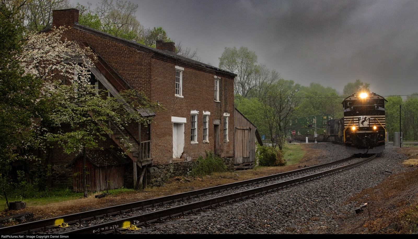 | Norfolk Southern train 203 (Rutherford, PA-Atlanta, GA intermodal) heads east through the village of Delaplane, Virgnia.