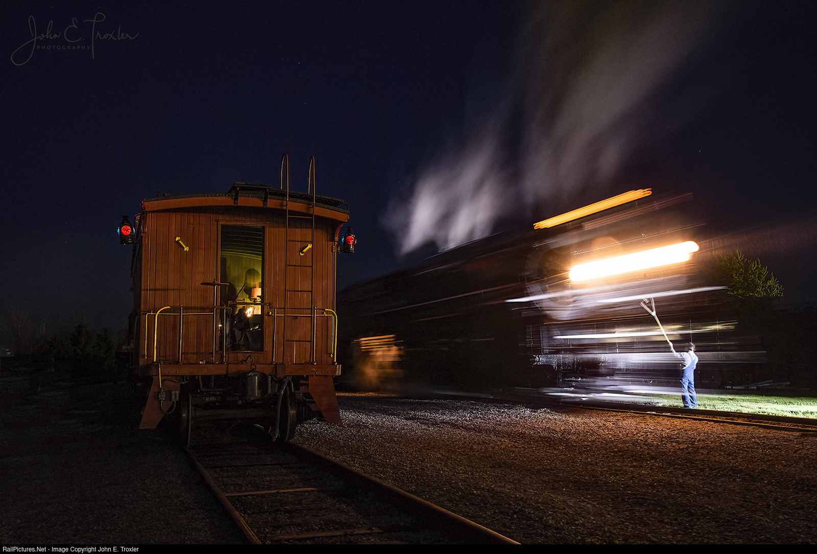 | A NKP tower operator hoops train orders up to the NKP 765 crew as she passes by the Wabash RR interchange track located in Ft. Wayne, IN. FWRHS photo shoot, set up and lighted by Chris Lantz. |