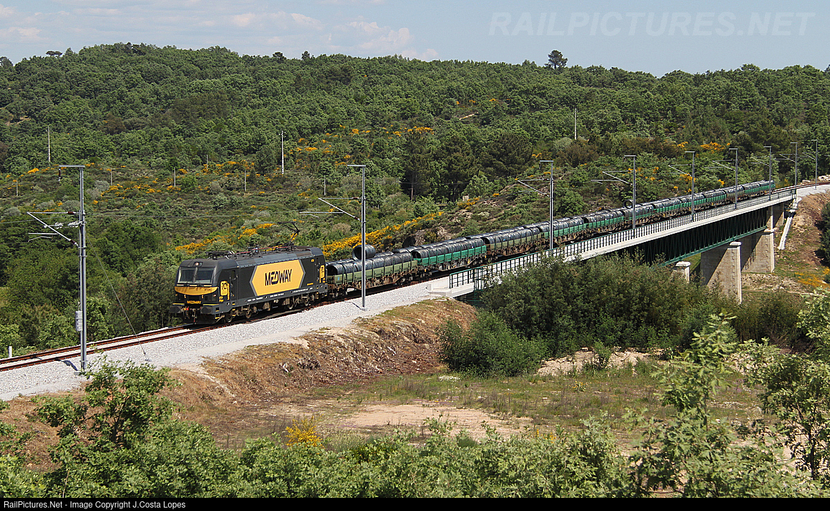 | A Medway freight train, 47840 from Vilar Formoso to Alfarelos, pulled by Siemens electric locomotive 4724, it's crossing the Corges River Bridge. |
