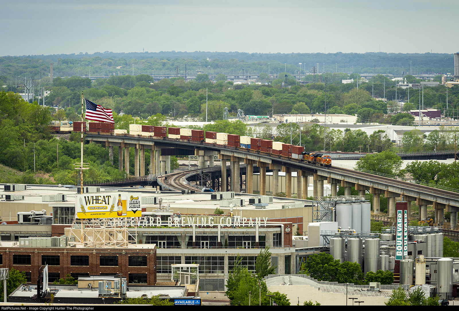 | An eastbound intermodal train crosses the flyover at Santa Fe Junction in Kansas City, crossing from Kansas into Missouri on a warm May 8, 2022. |