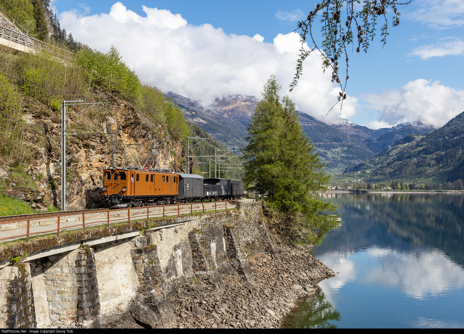 | Former Bernina Bahn locomotive Ge 4/4 # 81 of the Blonay-Chamby Railroad Museum, as guest on the old home rails, is running along the Lake Poschiavo between Le Prese and Miralago with a freight train. This was a R.M. photo charter train. |