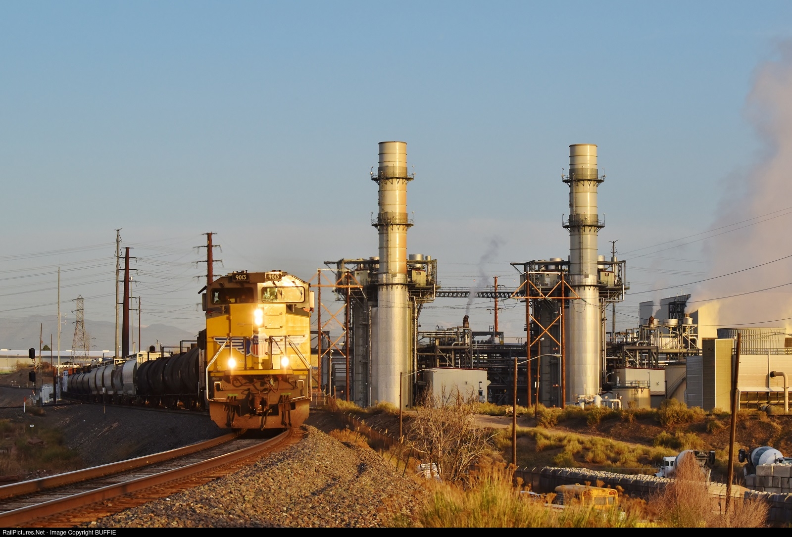 UP 9013 (SD70ACe) leads a freight past a power plant in northeast Denver.