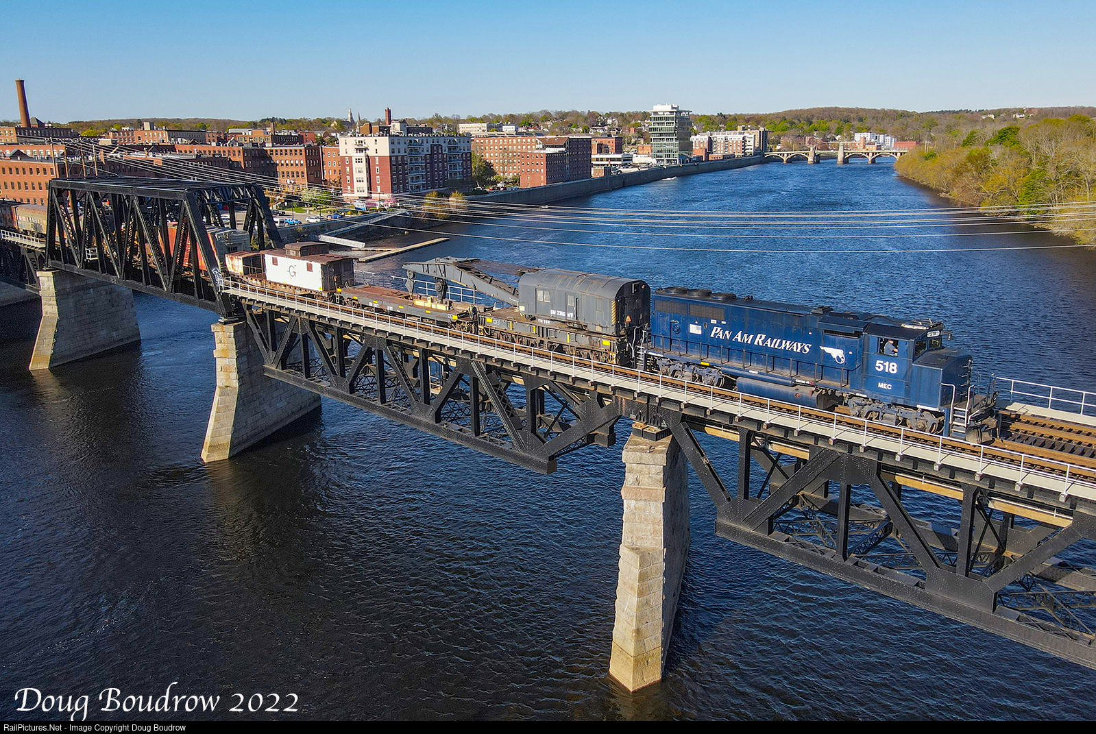 | The Pan Am Railways East Deerfield Wreck Train is seen being brought back to East Deerfield from Waterville crossing the Merrimack River in Haverhill. The train is using the symbol PO-3 for this part of the run based on the crew assigned. The American Brownhoist crane is of Boston & Maine lineage and will hopefully be preserved somewhere after the CSX takeover. |
