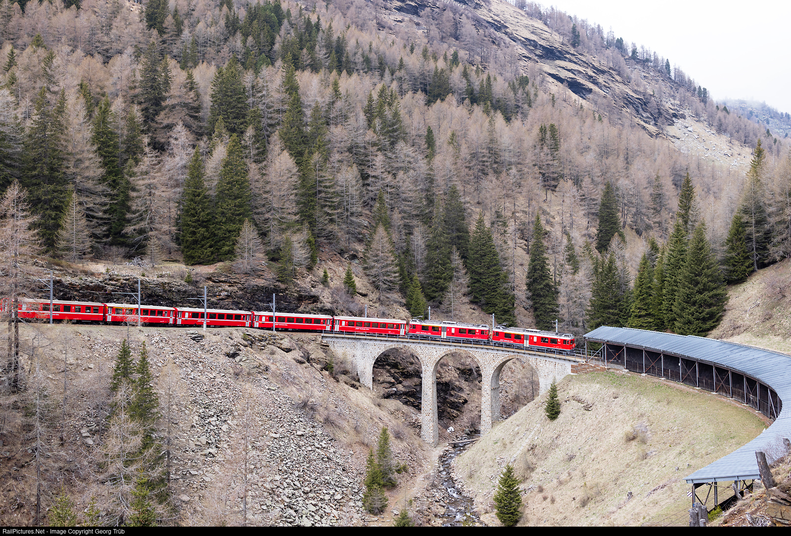 Railcars ABe 4/4 # 53 and # 52 of the Rhaetian Railway in multiple control are pulling regional train 4629 from St.Morritz over the Bernina pass to Tirano. The train is crossing the 50 meter long and up to 21 meter high Val da Pila (Pila valley) viaduct between Alp Grüm and Cavaglia. The line has a grade of 7.0 % and the viaduct is in a curve with 50 meter radius only.