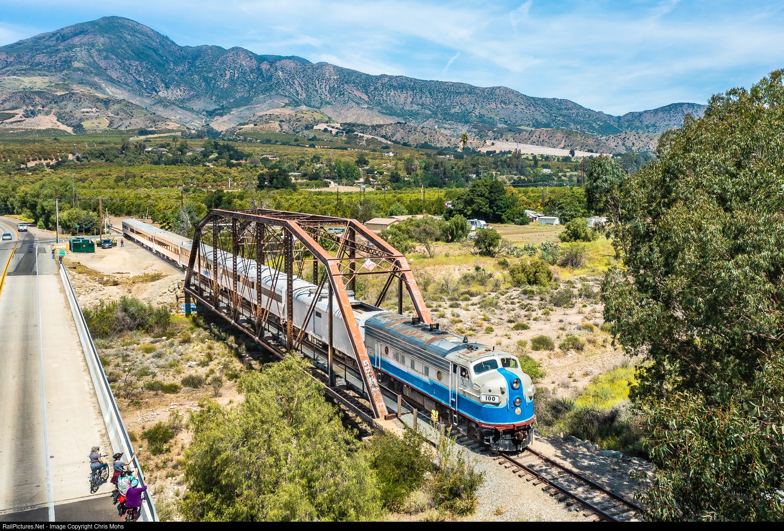 A group of bike riders stop to photograph Sierra Railroad F7A no. 100 with the Photographers Special crossing Sespe Creek in Fillmore.