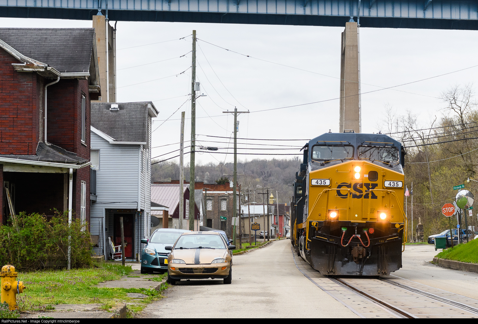 | After getting a crew change at the south end of town, CSX empty coal R129 rolls down the street running on Main Street in West Brownsville, Pennsylvania. A freshly repainted AC4400 leads the way as they head towards the bridge to cross the river and turn south. |