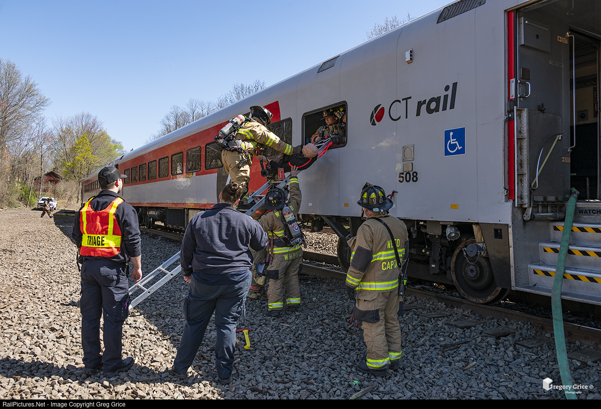 CTrail Extra 6499's "dummy passenger" gets a window exit evacuation from one of the Connecticut Department of Transportation's leased MBB BTC-3 coaches during a simulated emergency exercise at the Windsor Locks Yard siding on April 30th, 2021.