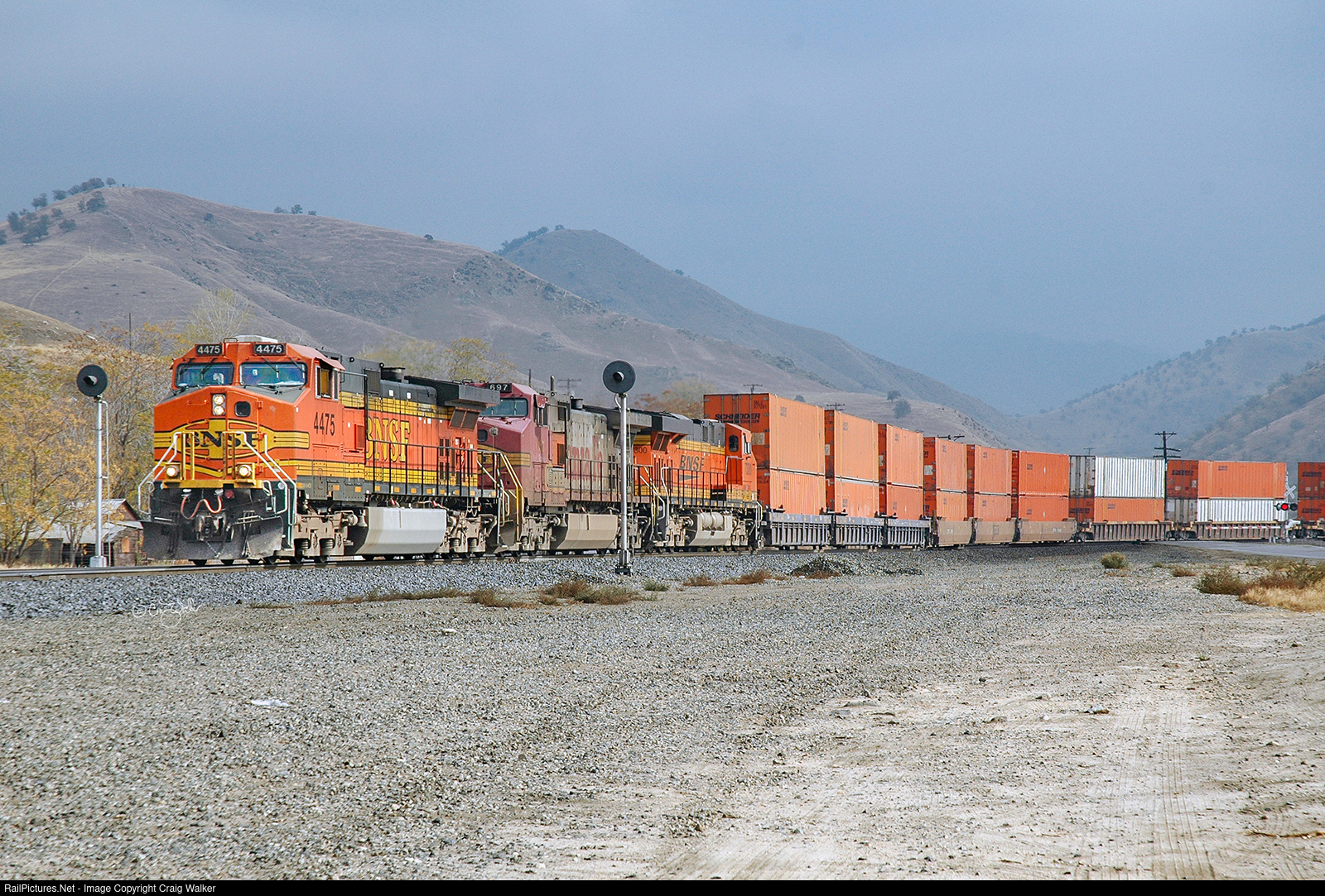 Splitting the searchlight signals in Caliente, BNSF intermodal train Z-KCKNBY1-05 descends Tehachapi Pass on its way from Kansas City to North Bay, the BNSF intermodal facility in San Pablo, California. BNSF Dash 9-44CW 4475, Dash 9-44CW 6978 and ES44DC 7300 are powering this train as the sun begins to burn through the cloud cover. (Caliente, California – November 7, 2009)