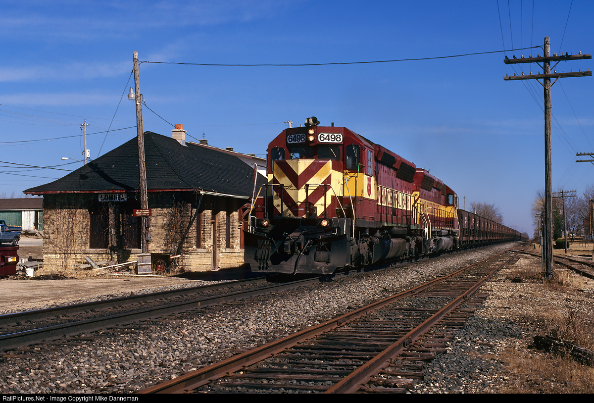 Bound for interchange to the Elgin, Joliet & Eastern Railway in Illinois, a southbound Wisconsin Central taconite ore train rumbles by the old Soo Line depot at Lomira, Wisconsin, on March 23, 1996. The train is utilizing Duluth, Missabe & Iron Range ore jennies.