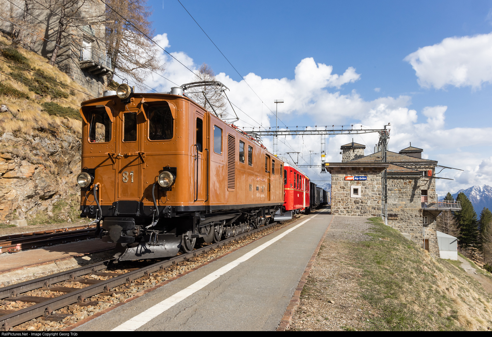 Former Bernina Railway locomotive Ge 4/4 # 81, built in 1916, now owned and operated by the Blonay-Chamby Railroad Museum, as guest on the former home rails of the Bernina line. The photo charter freight train stopped in Alp Grüm. Assisting on the heavy grades of 7.0 % is railcar ABe 4/4 # 46 of the Rhaetian Railway of 1965.