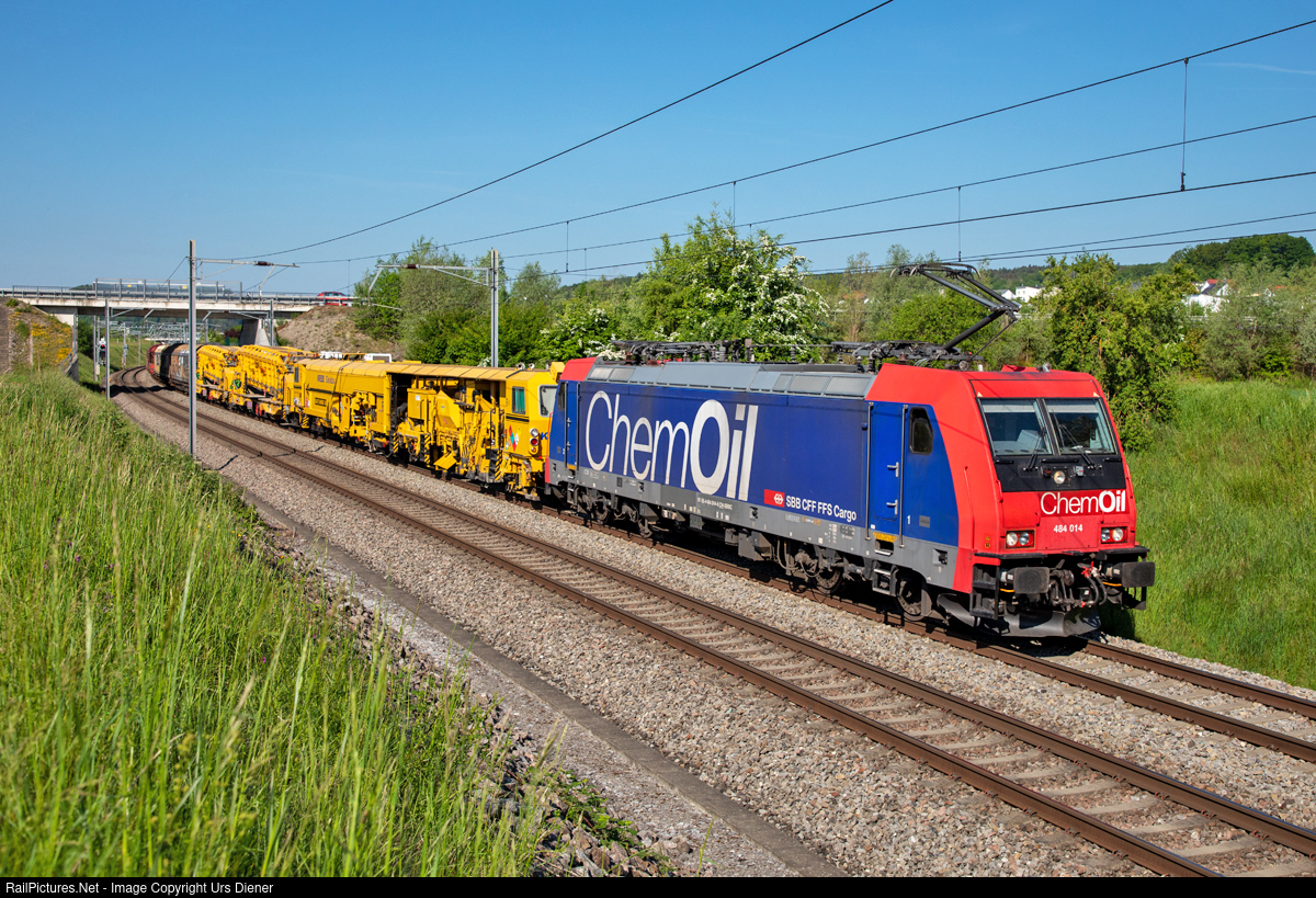 | The Bombardier Traxx F140 MS2 locomotive 484 014 of SBB Cargo, with CHEMOIL publicty paint scheme, is leading the mixed freight train 44612 from Limmattal Yard to Singen (Hohentwiel). |
