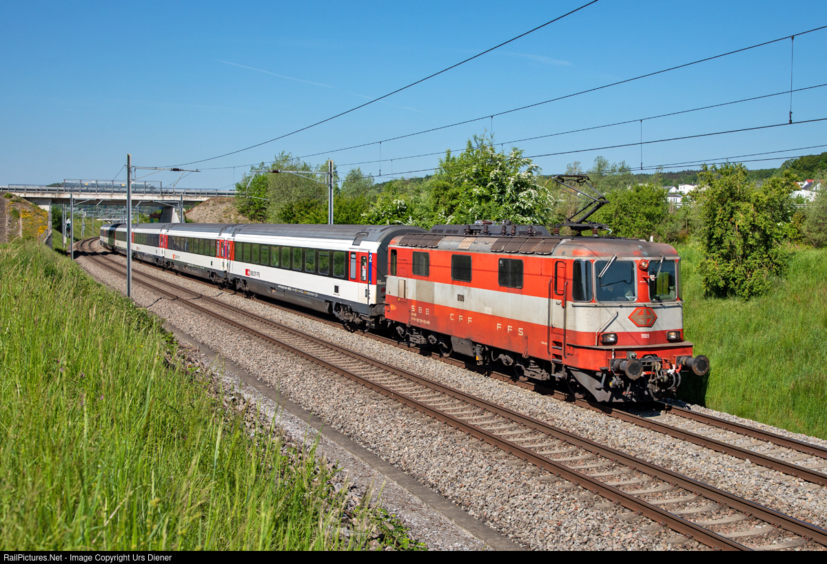 | The 1967 built SBB locomotive Re 4/4 II 11109, now the last operational with the former Swiss-Express paint scheme, is leading train IC 380 from Zürich HB to Singen (Hohentwiel). |
